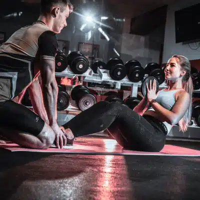A woman performs weighted sit-ups on a mat in a gym, holding a weight plate. A man kneels nearby, holding her feet for support. Dumbbells are visible on racks in the background.